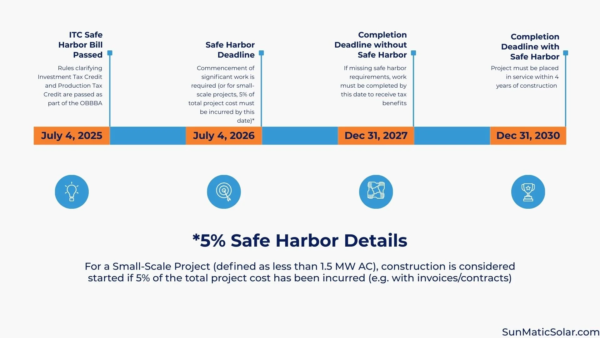 Projects not Safe Harbored by July 3rd, 2026 must be placed in service by December 31, 2027 to qualify for the solar tax credit